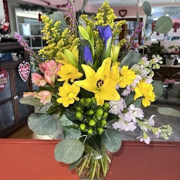 This cheerful and colorful bouquet features bright yellow lilies, blue iris, green hypericum berries, yellow daisies, pink alstroemeria, pink stock, solidago, eucalyptus, and a pop of purple blooms. Arranged in a classic ginger vase, it brings warmth and joy to any room.