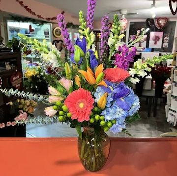 hydrengea, red gerberas, orange lilies, white snapdragons, blue iris, and purple stock, this lively mix is accented with pink alstroemeria, eucalyptus, green hypericum berries, salal, and tree fern. Arranged in a classic ginger vase, it brings mountain-inspired charm to any setting.