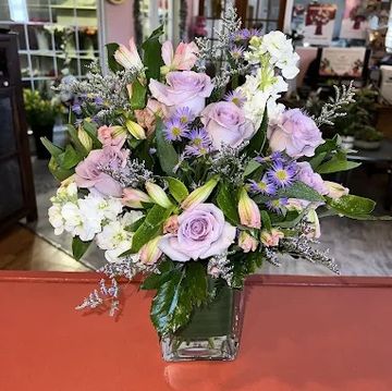 Glass cube vase with greenery, lavender roses, white stock, pink alstroemeria, purple Monte Casino, limonium, salal, and tree fern.