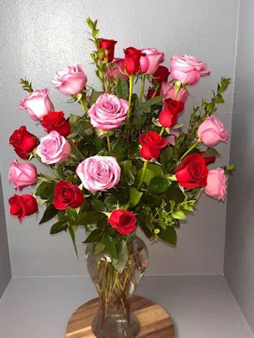 Featuring 12 red roses and 12 pink roses arranged in a tall, clear glass vase with flowing Italian ruscus, this arrangement makes a bold and heartfelt statement. Perfect for anniversaries, celebrations, or simply saying “I love you” in the most elegant way.