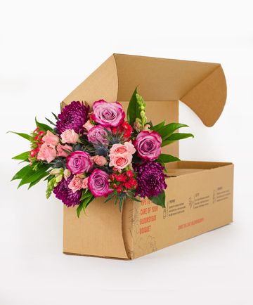 This lively mix features fuchsia gerberas, yellow roses, purple daisies, pink carnations, purple larkspur, and Monte Casino. Accented with eucalyptus and salal, it’s beautifully arranged in a tall 12" glass vase for a bold, cheerful display.