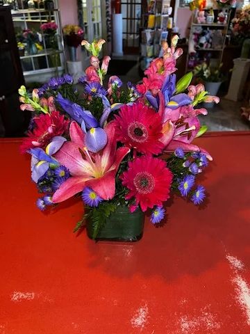 Featuring blue iris, purple Monte Casino, bright gerbera daisy, and soft pink snapdragons, this arrangement is accented with leather leaf and designed in a modern square vase with lush green foliage inside. It’s a joyful display perfect for brightening any space or lifting someone’s spirits.
