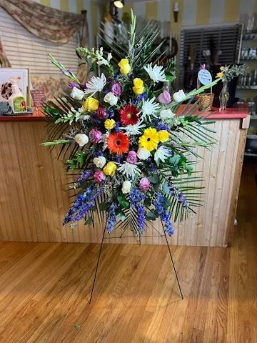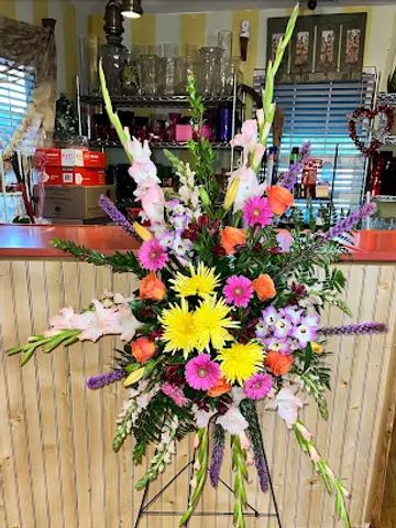 Featuring gerberas, elegant roses, tall snapdragons, graceful gladiolus, fragrant lilies, and cheerful spider mums, this arrangement is accented with alstroemeria, Italian ruscus, leather leaf, and tree fern. It’s a joyful tribute perfect for any occasion that calls for color and celebration.