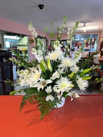 Featuring white spider mums, larkspur, lilies, and alstroemeria, this design is beautifully accented with Italian ruscus, leather leaf, and salal for a timeless, soothing presence. It’s a perfect tribute for moments that call for quiet reflection and heartfelt remembrance.