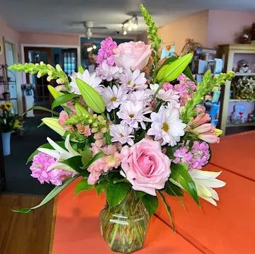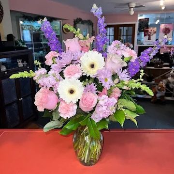 This soft, garden-inspired arrangement features lavender larkspur, white gerbera daisies, pink snapdragons, pink roses, pink stock, lavender daisies, and pink carnations. with salal and tree fern, it’s presented in a charming ginger vase—perfect for brightening any space.