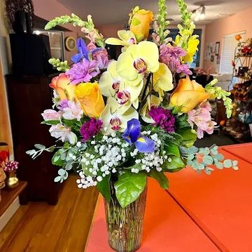 This arrangement features tiger orchids, daisies, yellow roses, baby’s breath, purple carnations, pink and white snapdragons, and pink alstroemeria. with silver dollar eucalyptus, salal, and tree fern, it's artfully arranged in a tall 14" .